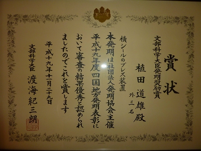 平成19年度四国地方発明表彰にて「文部科学大臣発明奨励賞」、「実施功績賞」を受賞